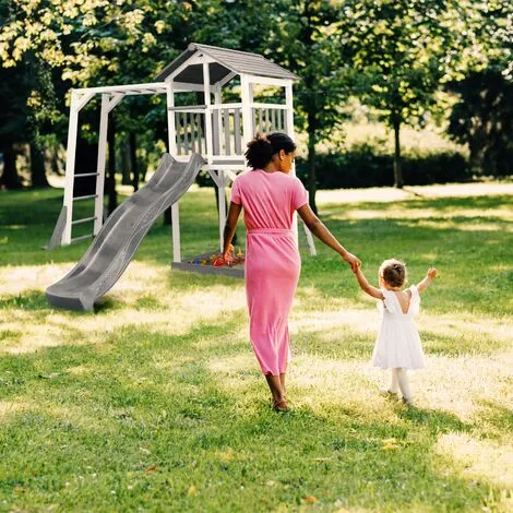 Elle dispose d’un toboggan de 220 cm avec raccordement d’eau, et d’un bac à sable installé sous la plateforme, pour environ 125 kg de sable, dim 105 x 101 x 10 cm