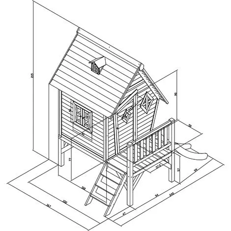 La hauteur de la plate-forme est de 57 cm et sa hauteur totale est de 215 cm. La maison de jeu mesure 167 cm de long et 240 cm de large. En raison de sa conception Crooked, cette maison de jeu a une dimension intérieure différente. La largeur du sol est de 89 cm, la largeur maximale