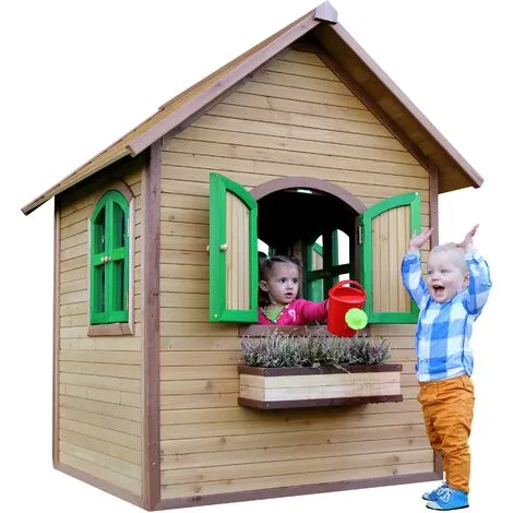 Vos enfants peuvent jouer pendant des heures avec cette maisonnette de grande qualité, fabriquée avec un bois très résistant, naturellement imputrescible, insensible aux champignons et insectes. Bois non-traité chimiquement, donc plus écologique et plus sur pour les enfants: 100% cèdre Cunninghemia lanceolata. Panneaux de 15mm, châssis: 38mm. Dimensions au sol: Largeur 118 x profondeur 172 x174cm (H)