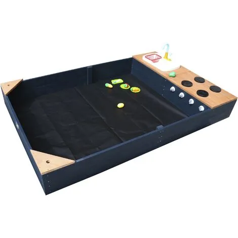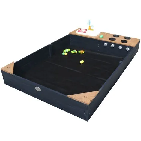 Le bac à sable Kelly avec cuisine de jeu, y compris l’évier en anthracite et brun par AXI est un ajout à un jardin! Les enfants peuvent jouer dans le bac à sable ou se rendre au travail dans la cuisine de jeu. Merci aux accessoires inclus tels que plaques, planche à découper et les fruits et légumes, vos enfants peuvent cuire leur cœur dans la cuisine de jeu. De coupe, la cuisson et la cuisson des légumes devient littéralement un jeu d’enfant! Les fruits et légumes peuvent être « découpé en tranches » dans la moitié au moyen de velcro. Avec les boutons tournants, les enfants peuvent également jouer avec le poêle. Idéal pour la cuisson des légumes! Kelly est en bois FSC stable et durable et dispose d’une bâche à portée de main et la couverture du sol. Ceci maintient la sécurité de sable et propre. Le