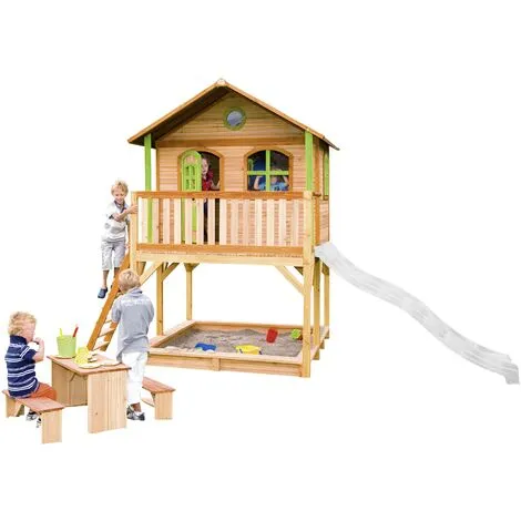 La maison de jeu Marc a une hauteur de plate-forme de 118 cm et est équipée d’un grand toboggan de 228 cm de long. L’échelle et le toboggan peuvent être fixés à gauche et à droite. Lorsque les enfants ont fini