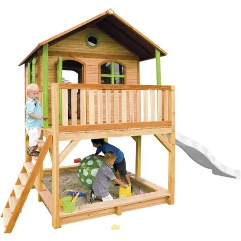Marc Playhouse d’AXI a vraiment tout ce que vos enfants peuvent souhaiter ! Une échelle pour monter dans le chalet et descendre le long toboggan. Et puis ils n’ont pas encore fini, parce qu’il y a aussi un bac à sable sous la maison de jeu où ils peuvent tous faire cuire des gâteaux de sable ensemble. Dans cette maison de jeu, ils peuvent se raconter les meilleurs secrets. Dès qu’ils ferment les fenêtres et la porte, personne ne peut plus les écouter ! Marc est une maison de jeu polyvalente en bois avec une porte semi-circulaire et des fenêtres. La porte a une boîte aux lettres où les enfants peuvent jeter le courrier lorsqu’ils jouent au facteur.
