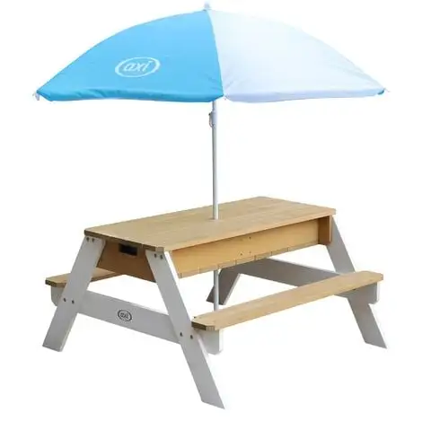 La table de pique-nique Sable et Eau Nick , d’ AXI , est une table de pique-nique multifonctionnelle. Nick a une pièce secrète avec deux bacs bleus (capacitĂ©: 8 litres chacun) sous le plateau amovible. Ces bacs bleus peuvent ĂŞtre remplis de sable et / ou d’eau, mais vous pouvez Ă©galement y stocker des jouets. De plus, les bacs sont amovibles, ce qui facilite leur nettoyage. La combinaison classique de sable et d’eau rencontre toujours le mĂŞme succès auprès des enfants! Jeu terminĂ© ? En un rien de temps, vous transformez cette table en une table de pique-nique oĂą les enfants peuvent crĂ©er, dessiner ou savourer des gourmandises.